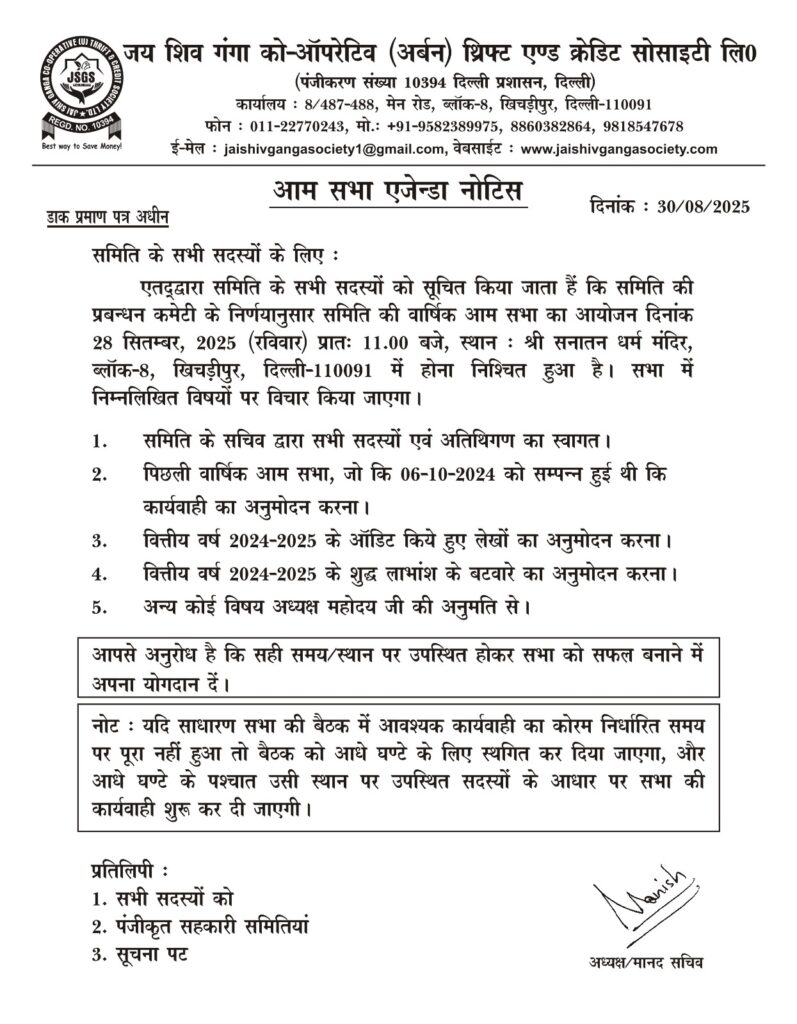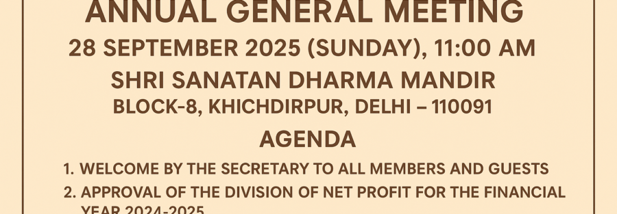 आपको सूचित किया जाता है कि हमारी सोसाइटी की वार्षिक साधारण सभा (Annual General Meeting – AGM) दिनांक 28 सितम्बर, 2025 (रविवार) को प्रातः 11:00 बजे आयोजित की जाएगी।