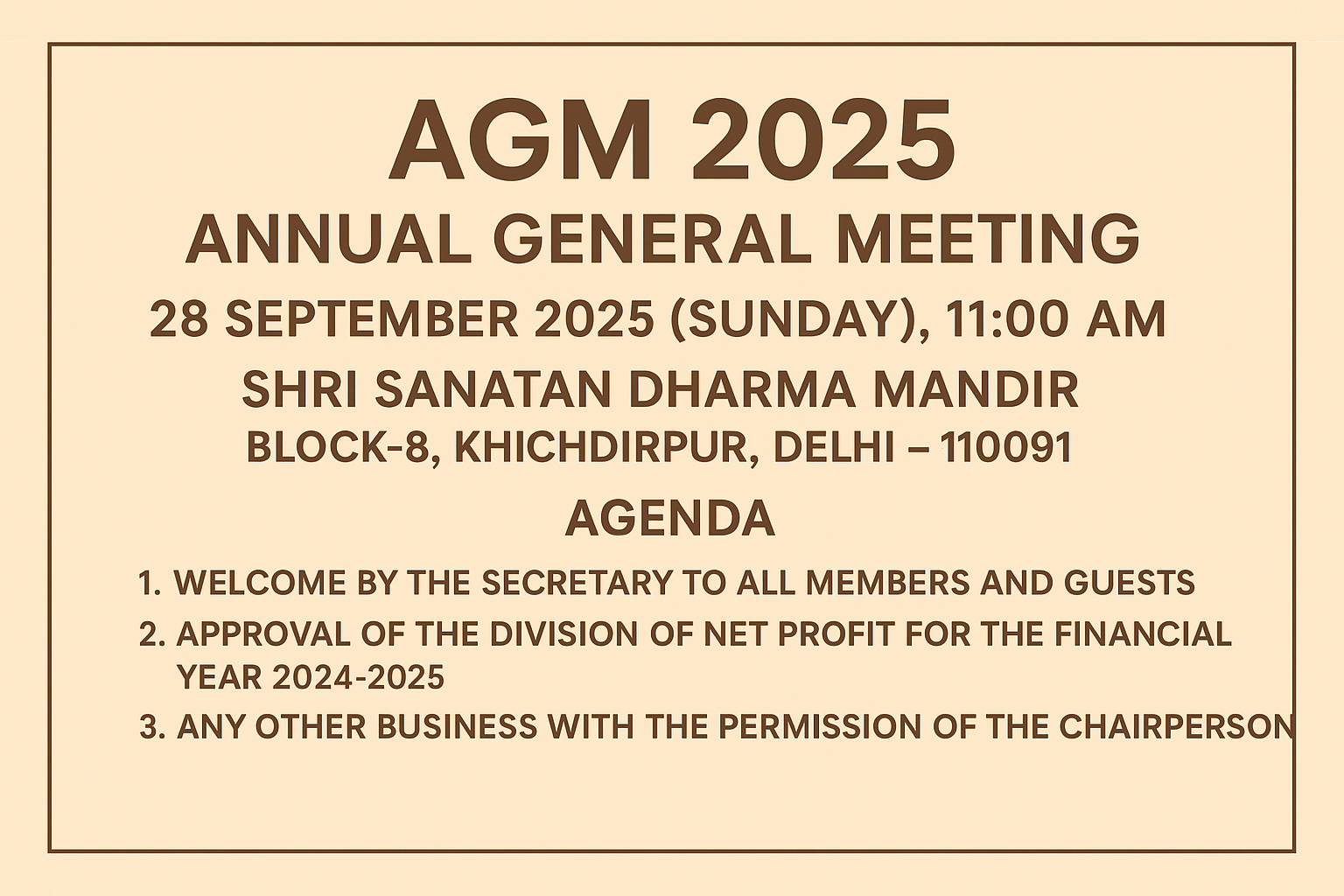 आपको सूचित किया जाता है कि हमारी सोसाइटी की वार्षिक साधारण सभा (Annual General Meeting – AGM) दिनांक 28 सितम्बर, 2025 (रविवार) को प्रातः 11:00 बजे आयोजित की जाएगी।